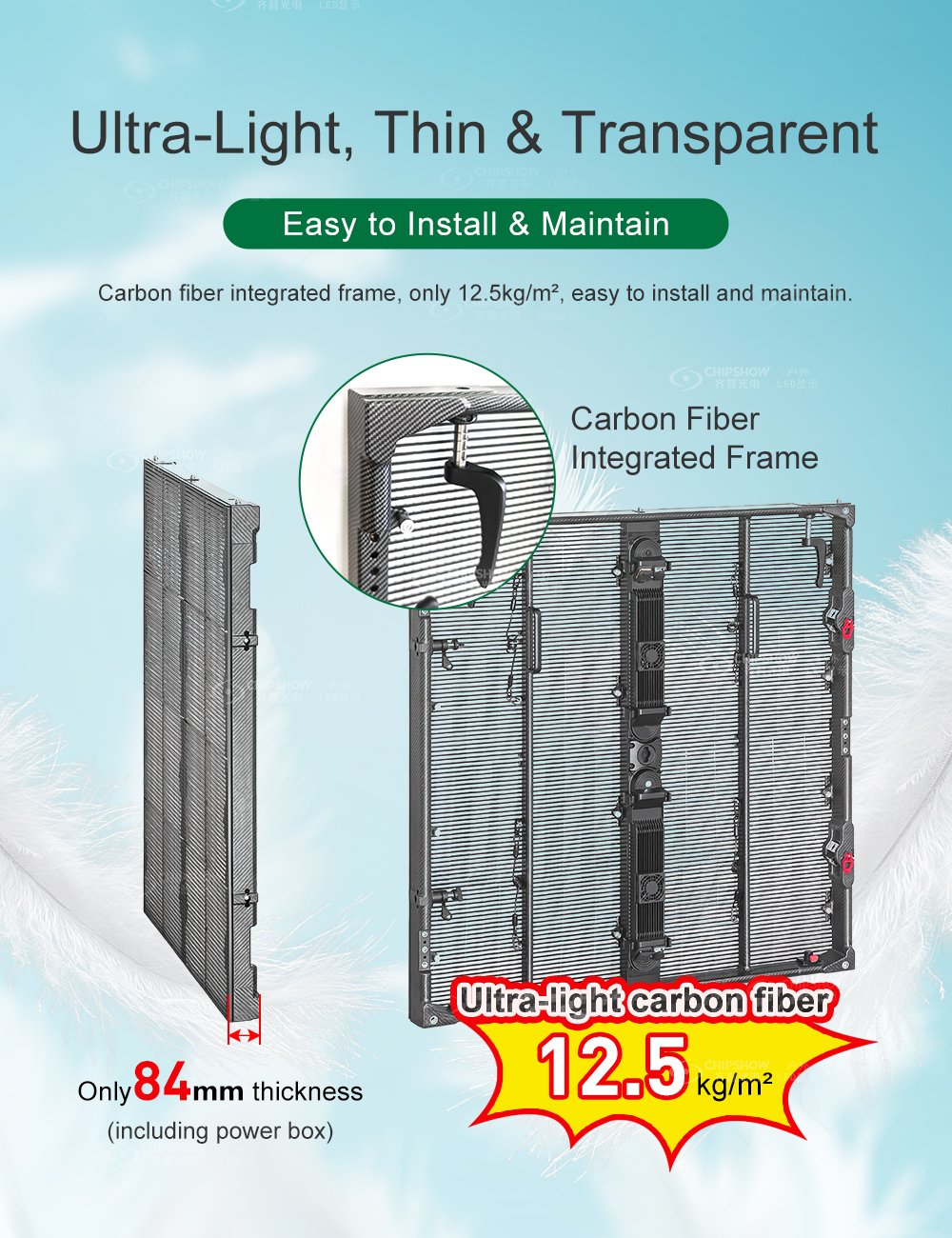 1 Fin et léger : la série C-Carbon adopte un cadre intégré en fibre de carbone qui ne pèse que 12,5 kg/㎡; cela le rend facile à installer et à entretenir ;