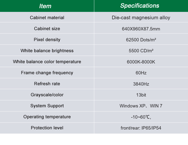 1 Excellente planéité, haute résistance à la déformation : la série C-Shine-Plus (GOB) adopte des boîtiers en aluminium moulé sous pression de qualité ADC-12 à haute résistance avec une bonne planéité et une bonne résistance à la déformation ; même si l'écran est fréquemment assemblé et démonté, les boîtiers peuvent toujours rester plats ;2 Conception pratique : suivant le principe d'être pratique et simple, les armoires adoptent un design minimaliste, comme des serrures rapides pratiques et des poignées larges et robustes ;3 modules magnétiques : il prend en charge la maintenance avant et arrière des modules ; grâce à l'emplacement magnétique entre les armoires, l'écran d'affichage peut être assemblé rapidement et avec précision.4 Hautes performances de protection : en plus de la technologie d'encapsulation GOB utilisée par les modules, les armoires sont équipées de bossages de pattes anti-collision et de coins de protection ; la surface de l'écran est donc hautement protectrice, ce qui évite grandement les dommages lors de l'installation et du transport ;La série C-Shine-Plus (GOB) prend en charge l'installation suspendue et l'installation au sol ; en tant que solution d'affichage économique et très efficace pour toutes sortes d'occasions d'installation de location, elle est populaire auprès des clients dans un large éventail d'industries (par exemple, l'énergie, l'armée, la sécurité publique, l'informatique, la finance et la justice) qui ont besoin de solutions d'affichage visuel numérique intelligentes ;