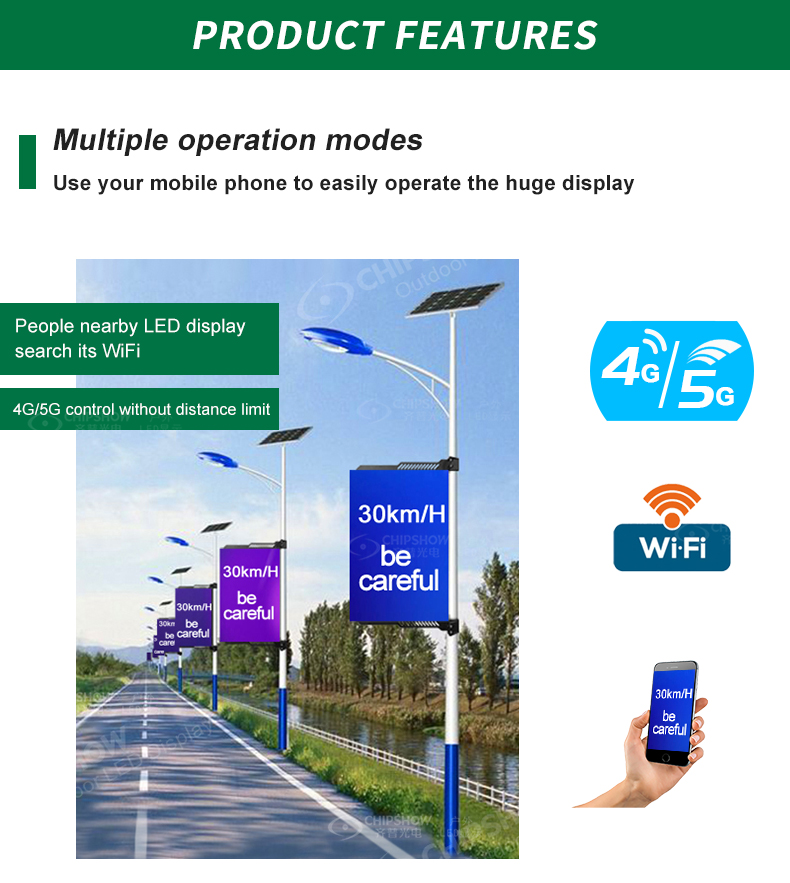 4 Télécommande réseau 4G/5G : avec la série C-Fit-Pole, vous pouvez établir un réseau à grande échelle dans lequel le nombre d'écrans LED sur poteau n'est pas limité ; de plus, son transfert de données à grande vitesse facilite l'envoi d'animations, de vidéos et d'images haute résolution ;