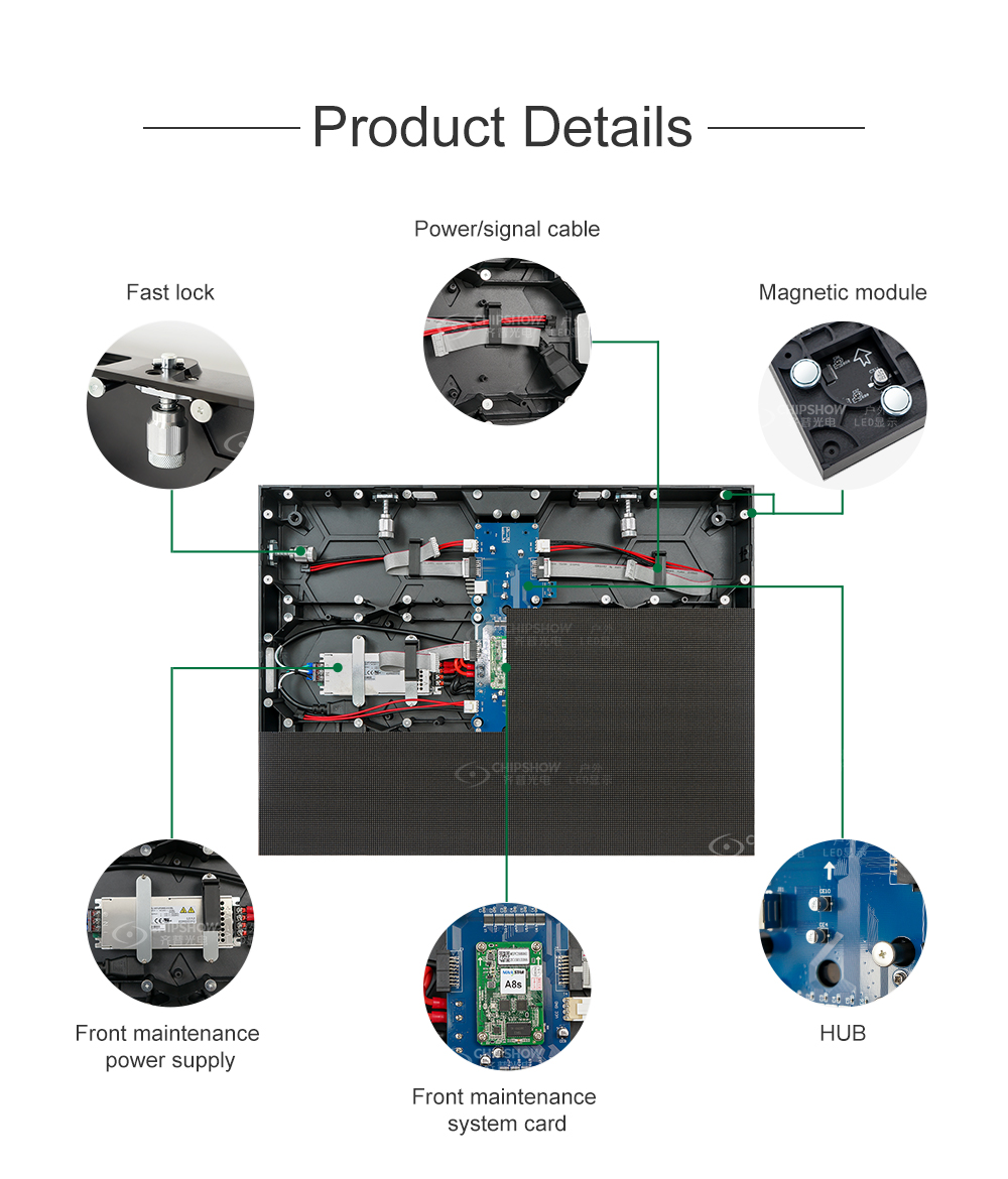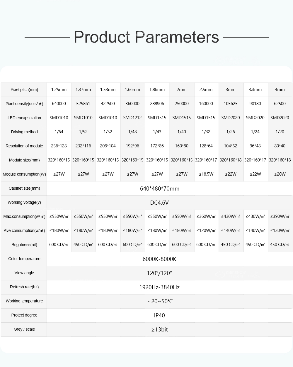 1. Taille de l'armoire 640 mm * 480 mm. peut être assemblé en grands écrans 4:3/16:9.