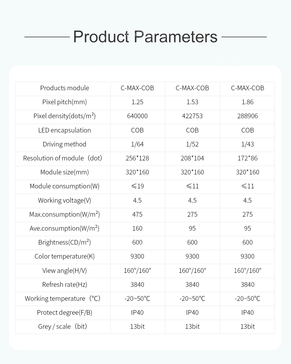 3 Bonne compatibilité : les pas de pixels de la série C-Max COB sont disponibles en 1,25 mm, 1,53 mm et 1,86 mm ; les boîtiers peuvent être compatibles avec nos modules de la série C-Max (P1.2/1.3/1.5/1.6/1.8/2/2.5/3/3.3/4) ; ainsi, lorsqu'il s'agit d'une mise à niveau supplémentaire de la solution pour des images de meilleure qualité, cela peut vous faire économiser un coût considérable en boîtiers ;
