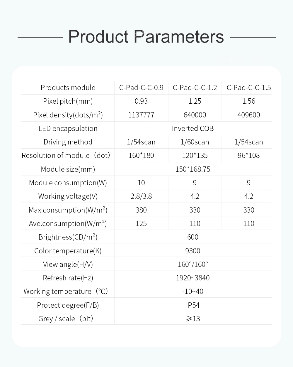 1, haute fiabilité : convient aux modules COB p0.9 p1.2 p1.5, résistant à l'humidité, anti-collision, surface antistatique, résistant aux empreintes digitales, la surface LED peut être nettoyée en douceur avec un chiffon.
