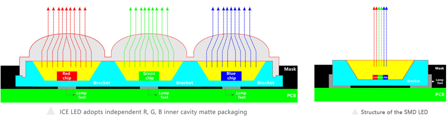 Par rapport aux LED SMD, les modules rouge, vert et bleu de la LED ICE sont encapsulés indépendamment ; cela contribue à une dissipation thermique plus rapide ;
