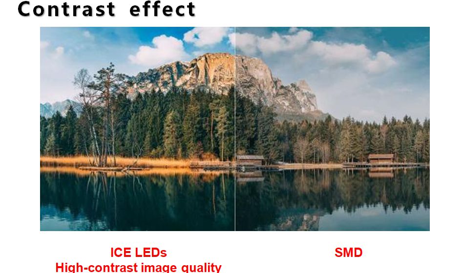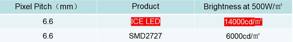 Et voici une comparaison de luminosité entre la LED P6.6 ICE et la LED P6.6 SMD (SMD2727) :