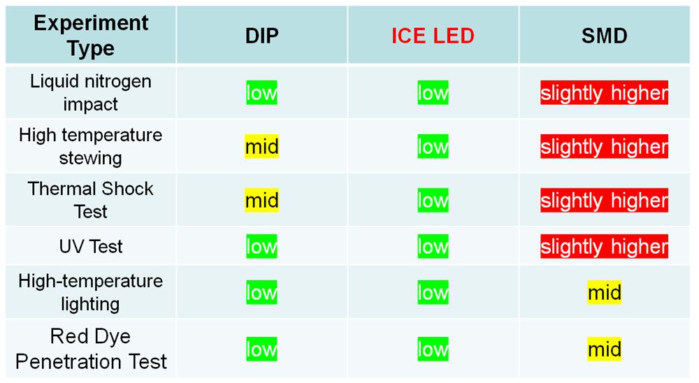Voici une comparaison des taux de défaillance entre les LED DIP, les LED SMD et notre LED ICE dans les mêmes conditions (* Remarque : la même condition signifie la même température haute/basse, le même temps de test et la même fréquence) :