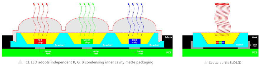 Dans la série C-Slim d'écrans LED Chipshow, nous n'utilisons pas de LED CMS ni de LED DIP conventionnelles. Nous créons et développons un type de LED avancé (« ICE (Independent Chip Encapsulation) LED beads »), intermédiaire entre les LED CMS et les LED DIP. C'est ce qui explique la différence remarquable de qualité et de performances entre nos écrans LED et ceux des autres marques d'écrans LED d'extérieur.