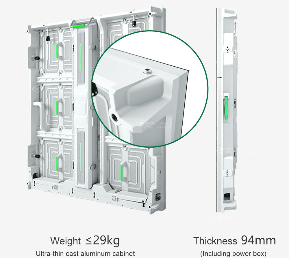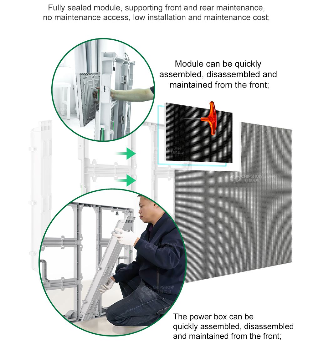 Maintenance avant et arrière : tous les composants (par exemple, les modules, les cartes système et les blocs d'alimentation) prennent en charge la maintenance avant ; cela peut vous faire gagner de la place pendant la maintenance ; et il prend également en charge l'installation murale ; Bonnes performances d'étanchéité : la technologie d'étanchéité latérale est appliquée entre les armoires ; les modules entièrement fermés sont étanches IP-65 et sont idéaux pour une utilisation en extérieur ; Ultra léger et fin : les armoires sont fabriquées en alliage de magnésium avec une excellente résistance ; chaque armoire (taille : 480 mm * 640 mm) ne pèse que 7,2 kg ; Faible bruit : l'écran d'affichage fonctionne sans utiliser de ventilateurs, le bruit est inférieur à 25 Db ; Installation rapide : il utilise des verrous rapides et des fiches aviation pour terminer la connexion et la configuration ; beaucoup de travail et de temps peuvent être économisés ; Assemblage flexible : la petite taille de l'unité (480 mm * 640 mm) offre aux utilisateurs la commodité d'assembler différentes tailles de panneaux/signalisations/panneaux d'affichage ; elle prend également en charge l'épissure avec les armoires de grande taille C-Slim (taille : 960 mm * 960 mm) ; par exemple, un écran d'affichage avec un rapport hauteur/largeur de 16:9 peut être facilement épissé ; Application : il peut être largement utilisé pour une large gamme de projets de publicité/diffusion en extérieur, tels que la publicité/diffusion dans les compétitions sportives, la publicité pour l'immobilier, la publicité d'image gouvernementale/d'entreprise, etc.