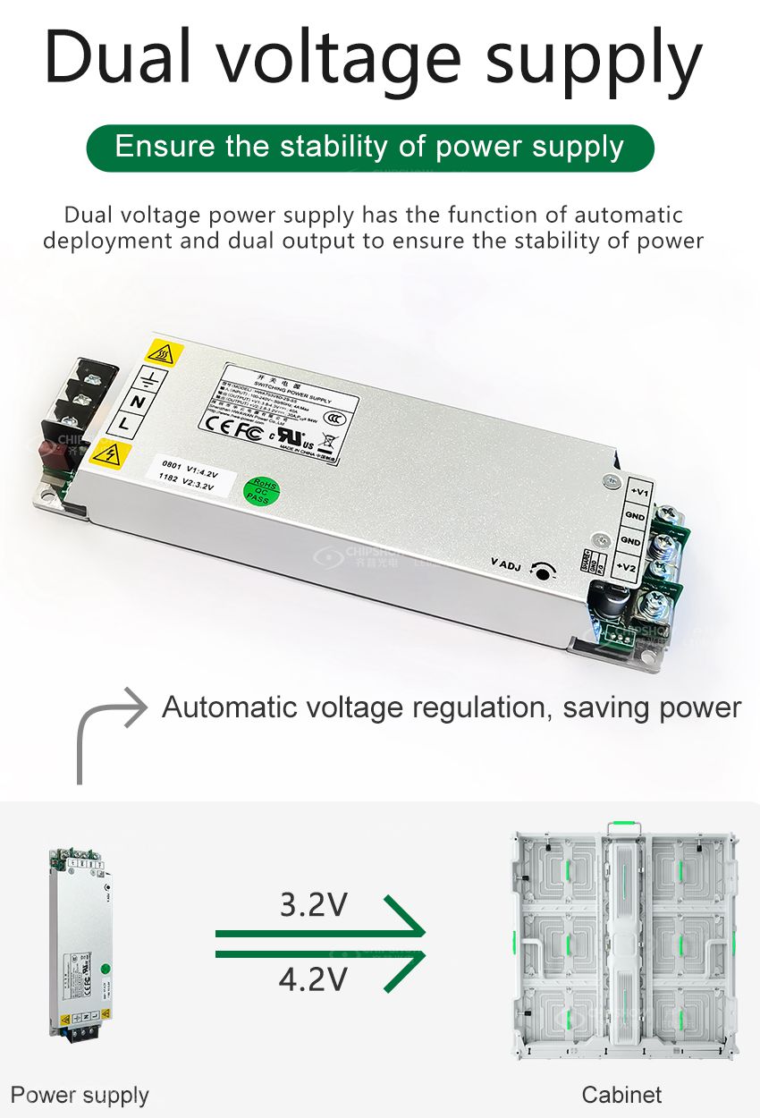 5 Le système d'alimentation double peut produire et ajuster automatiquement deux tensions de sortie différentes ; par conséquent, les écrans fonctionnent toujours avec une qualité d'alimentation très stable ;