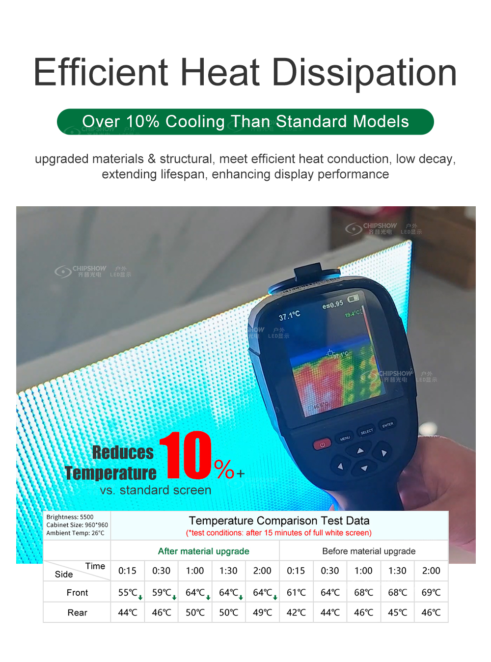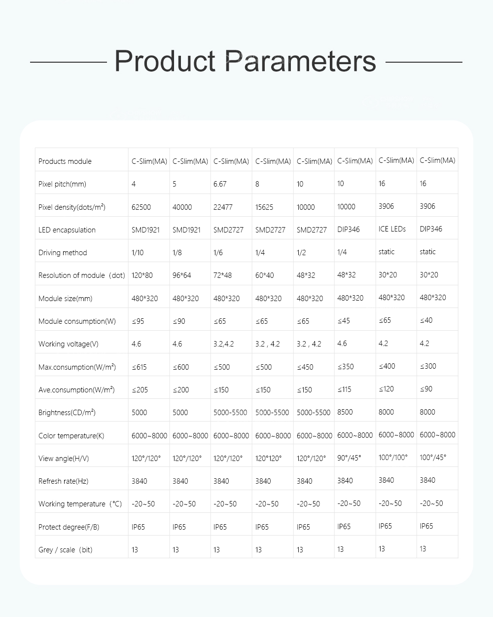 Profil de puissance pratique : Optimisé pour une utilisation commerciale standard avec une consommation d'énergie gérable (≤500 W/m² max sur les modèles clés), évitant la surconsommation d'énergie des écrans à ultra-haute luminosité.