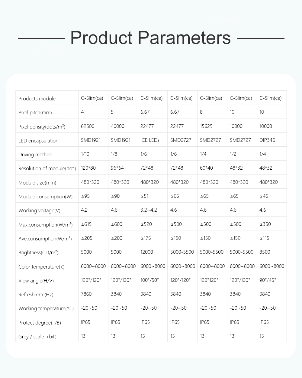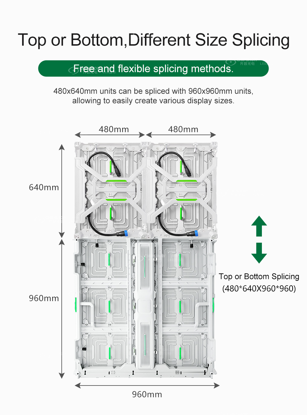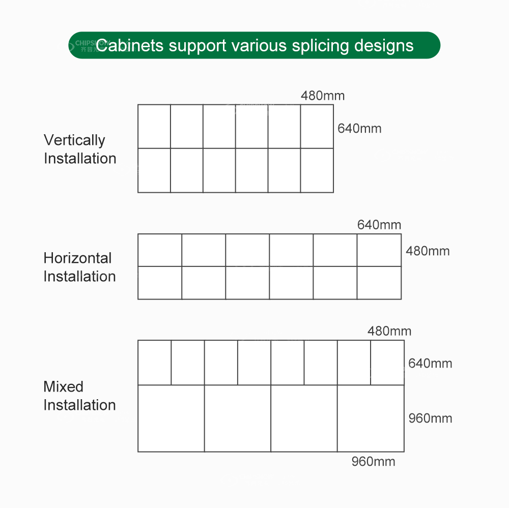Assemblage flexible : la petite taille de l'unité (480 mm * 640 mm) offre aux utilisateurs la commodité d'assembler différentes tailles de panneaux/signalisations/panneaux d'affichage ; elle prend également en charge l'épissure avec les armoires de grande taille C-Slim (taille : 960 mm * 960 mm) ; par exemple, un écran d'affichage avec un rapport hauteur/largeur de 16:9 peut être facilement épissé ;