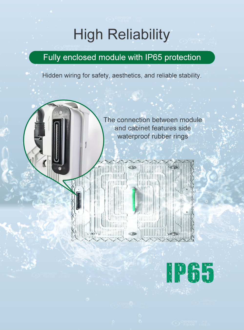 Bonnes performances d'étanchéité : la technologie d'étanchéité latérale est appliquée entre les armoires ; les modules entièrement fermés sont étanches IP-65 et sont idéaux pour une utilisation en extérieur ;