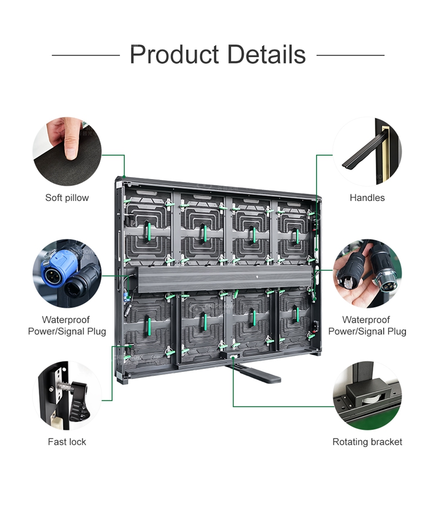 ◙ L'armoire est livrée avec un support rotatif à 90° et des verrous rapides gauche et droit pour un assemblage efficace de l'écran LED du stade.