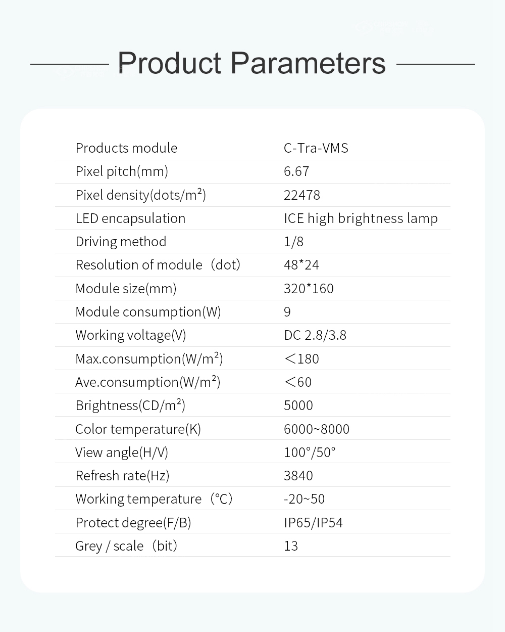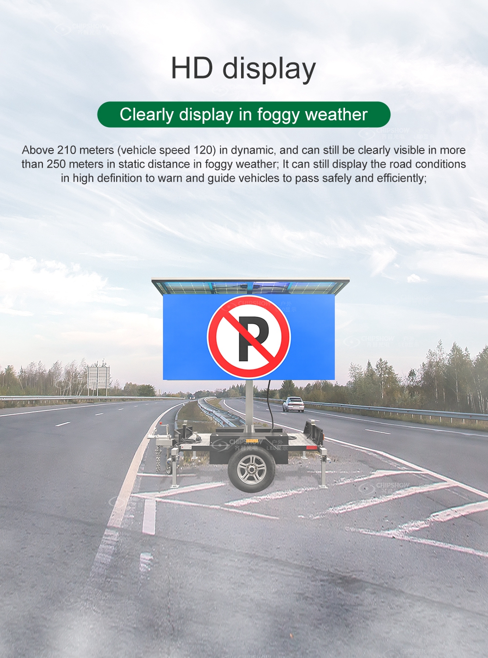 Affichage HD : au-dessus de 210 mètres (vitesse du véhicule 120) en dynamique, et peut toujours être clairement visible à plus de 250 mètres en distance statique par temps brumeux ; Il peut toujours afficher les conditions routières dans haute définition pour avertir et guider les véhicules pour qu'ils dépassent en toute sécurité et efficacement ;