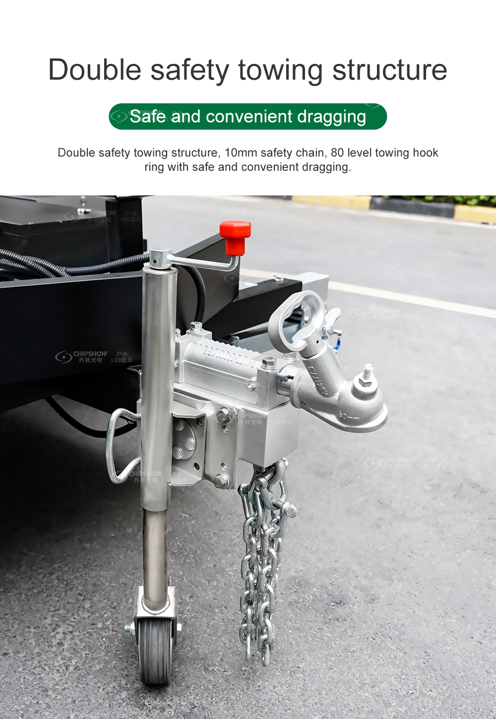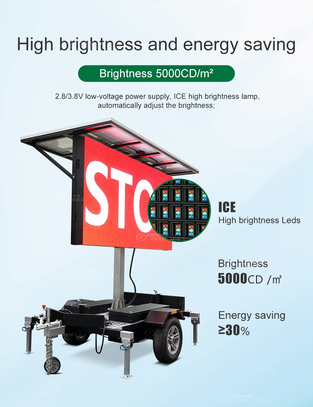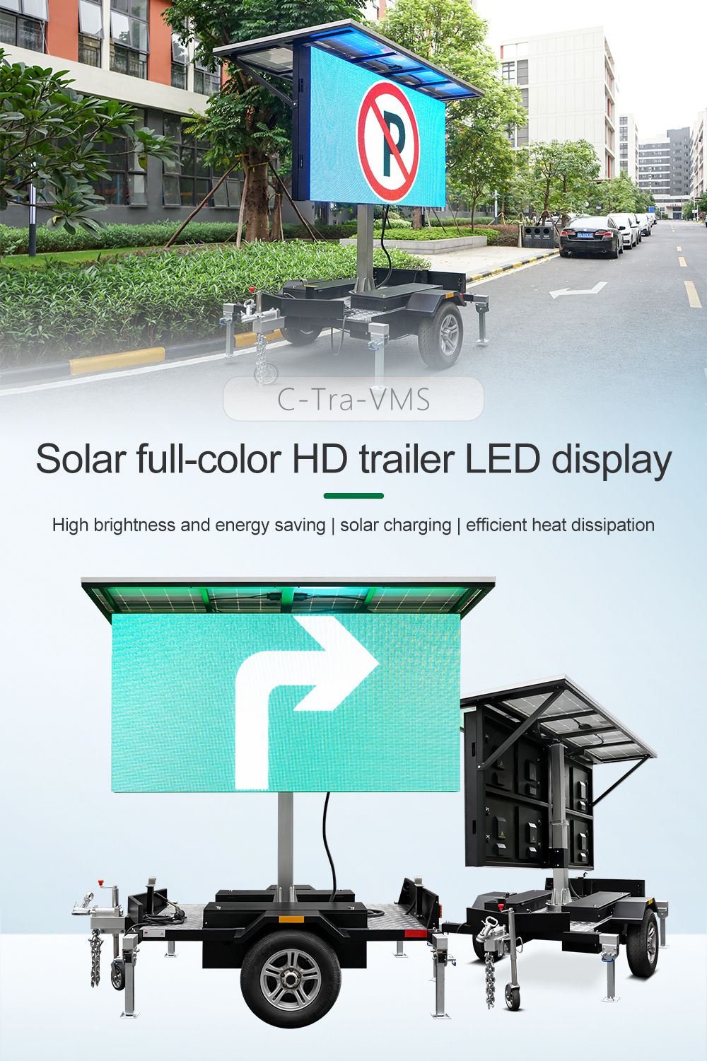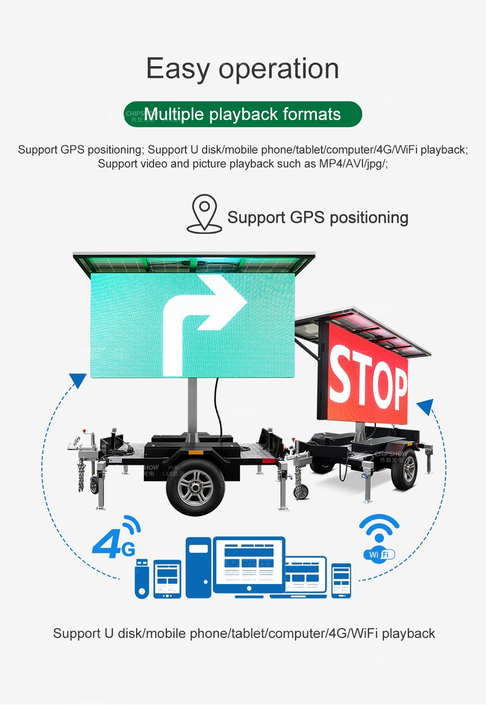 1. Haute luminosité et économie d'énergie : alimentation basse tension 3,2/4,2 V, 4535 LED 3 en 1 haute luminosité, luminosité ≥ 10 000 CD/㎡ ; La luminosité peut être ajustée automatiquement ; 2. Affichage HD : au-dessus de 210 mètres (vitesse du véhicule 120) en dynamique, et peut toujours être clairement visible à plus de 250 mètres en distance statique par temps brumeux ; Il peut toujours afficher les conditions routières en haute définition pour avertir et guider les véhicules afin qu'ils dépassent en toute sécurité et efficacement ; 3. Dissipation thermique efficace : dissipation thermique à pression négative à grand débit dans l'armoire, décharge thermique efficace et fonctionnement plus stable de l'affichage LED ; 4. Chargement solaire + batterie de grande capacité de 9,6 kWh, qui peut alimenter en continu l'écran LED 365 jours par an ; 5. Structure rotative de levage hydraulique ; L'écran entier plane à 1 m de hauteur et à 360 ° pour lire les informations à n'importe quelle hauteur et angle. 6. Structure de remorquage à double sécurité, chaîne de sécurité de 10 mm, anneau de crochet de remorquage à 80 niveaux avec traînage sûr et pratique. 7. Le connecteur de signal à 7 cœurs peut contrôler l'indicateur de remorque certifié EMARK, le feu stop, le clignotant et le feu latéral dans tout le véhicule. 8. Prise en charge du positionnement GPS ; Prise en charge de la lecture de disque U/téléphone portable/tablette/ordinateur/4G/WiFi ; Prend en charge la lecture de vidéos et d'images telles que MP4/AVI/jpg/ ; 9. Il est principalement utilisé pour le guidage du trafic sur portique à grande vitesse et sur cadre F ; Panneaux d'avertissement de sécurité pour les véhicules de réparation routière, les véhicules de nettoyage, les véhicules d'assainissement et autres véhicules d'exploitation routière.
