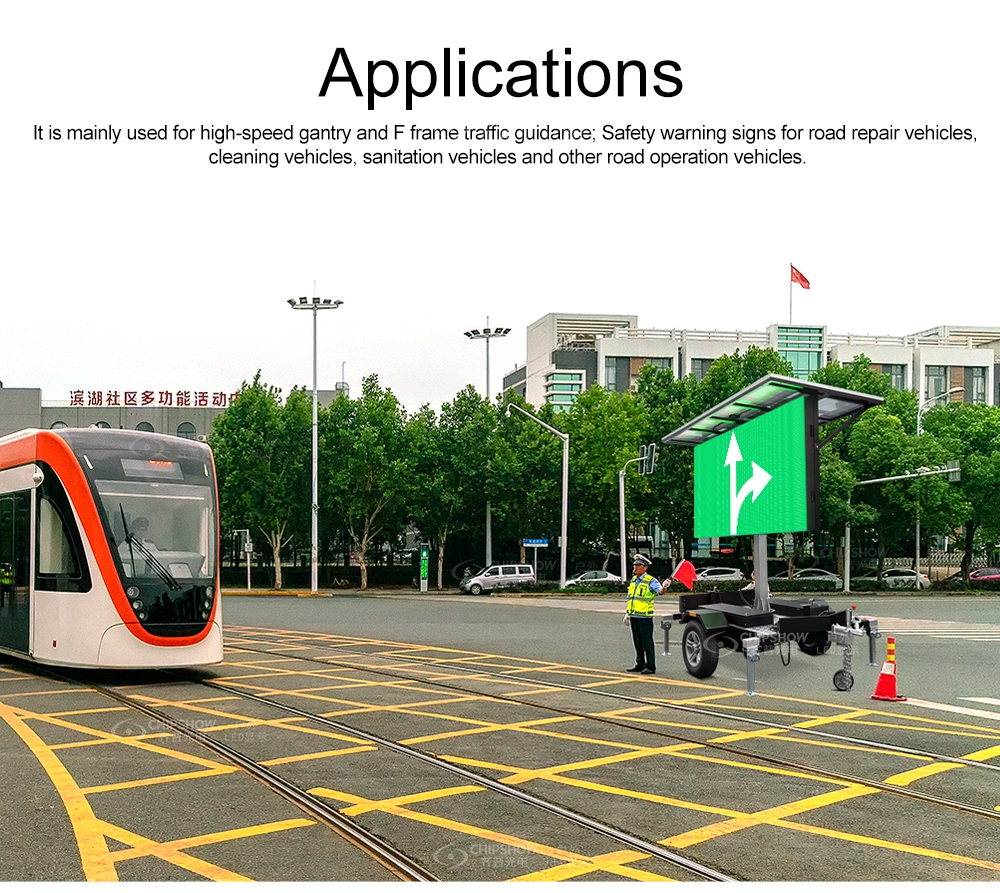 Il est principalement utilisé pour les portiques à grande vitesse et Guidage du trafic à trame F ; Panneaux d'avertissement de sécurité pour les véhicules de réparation routière, véhicules de nettoyage, véhicules d'assainissement et autres véhicules d'exploitation routière.