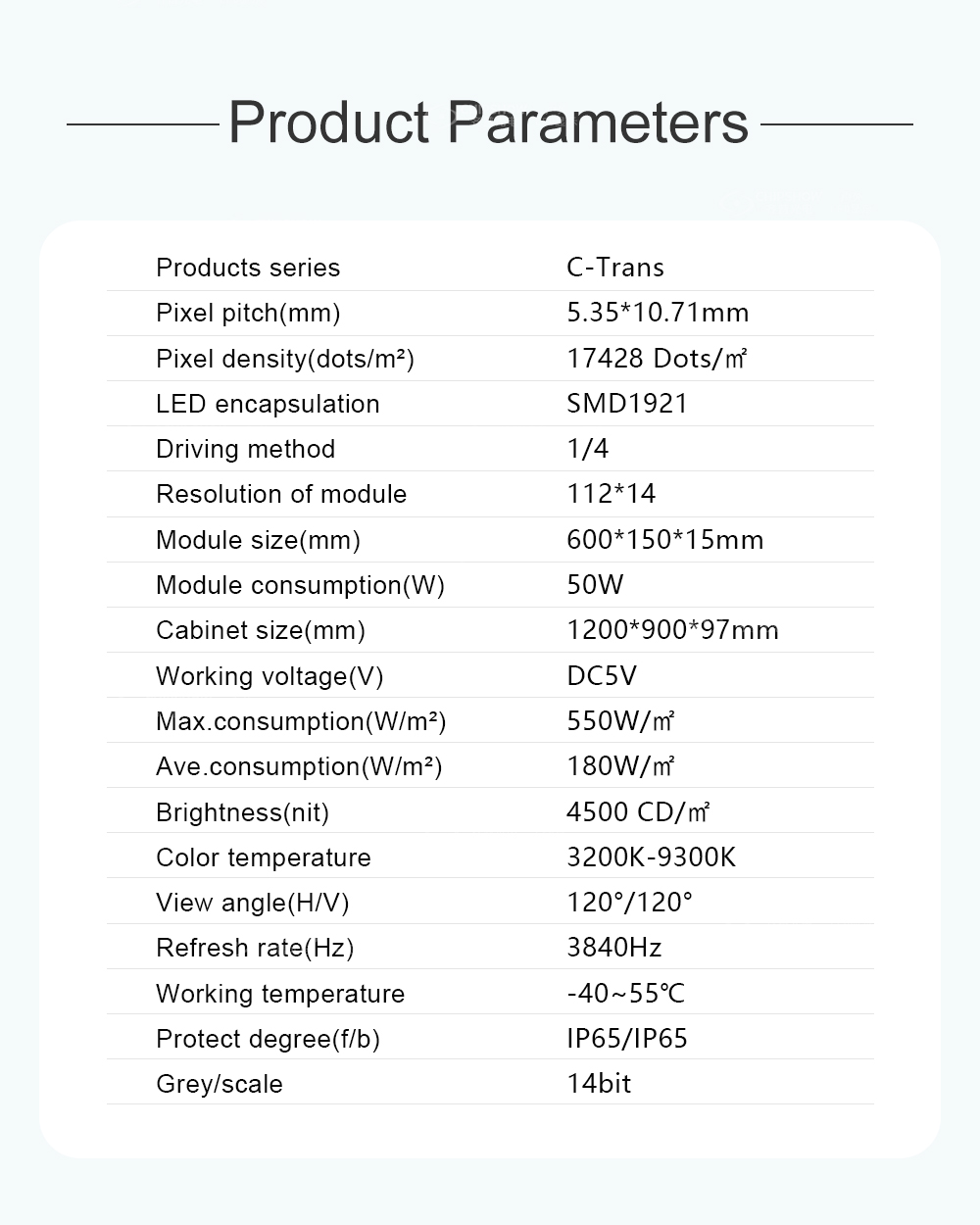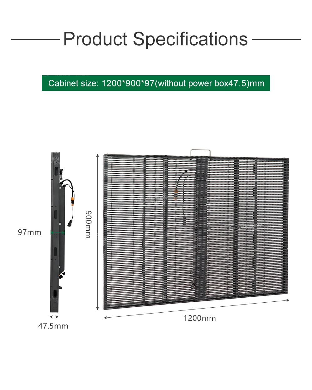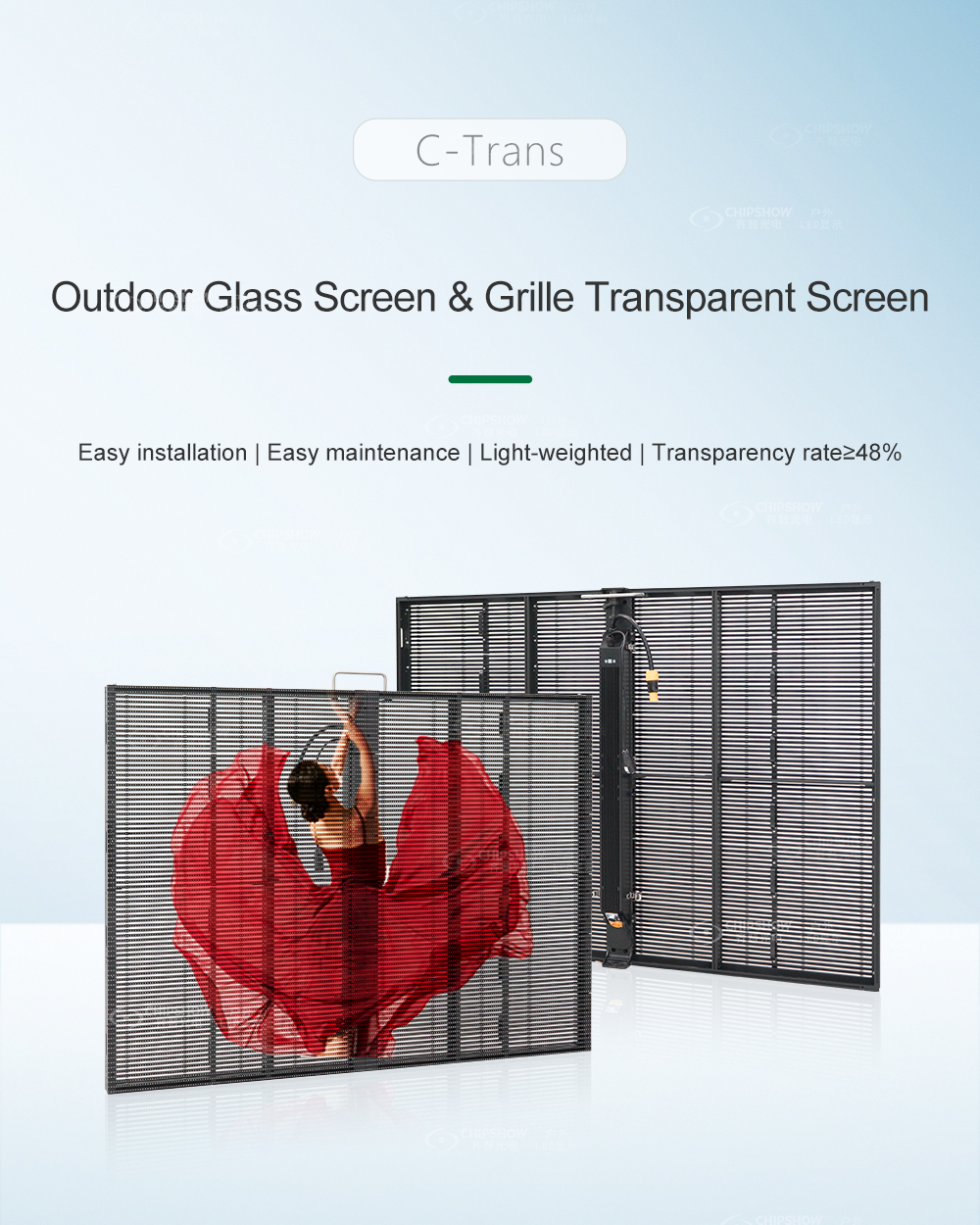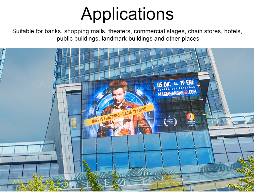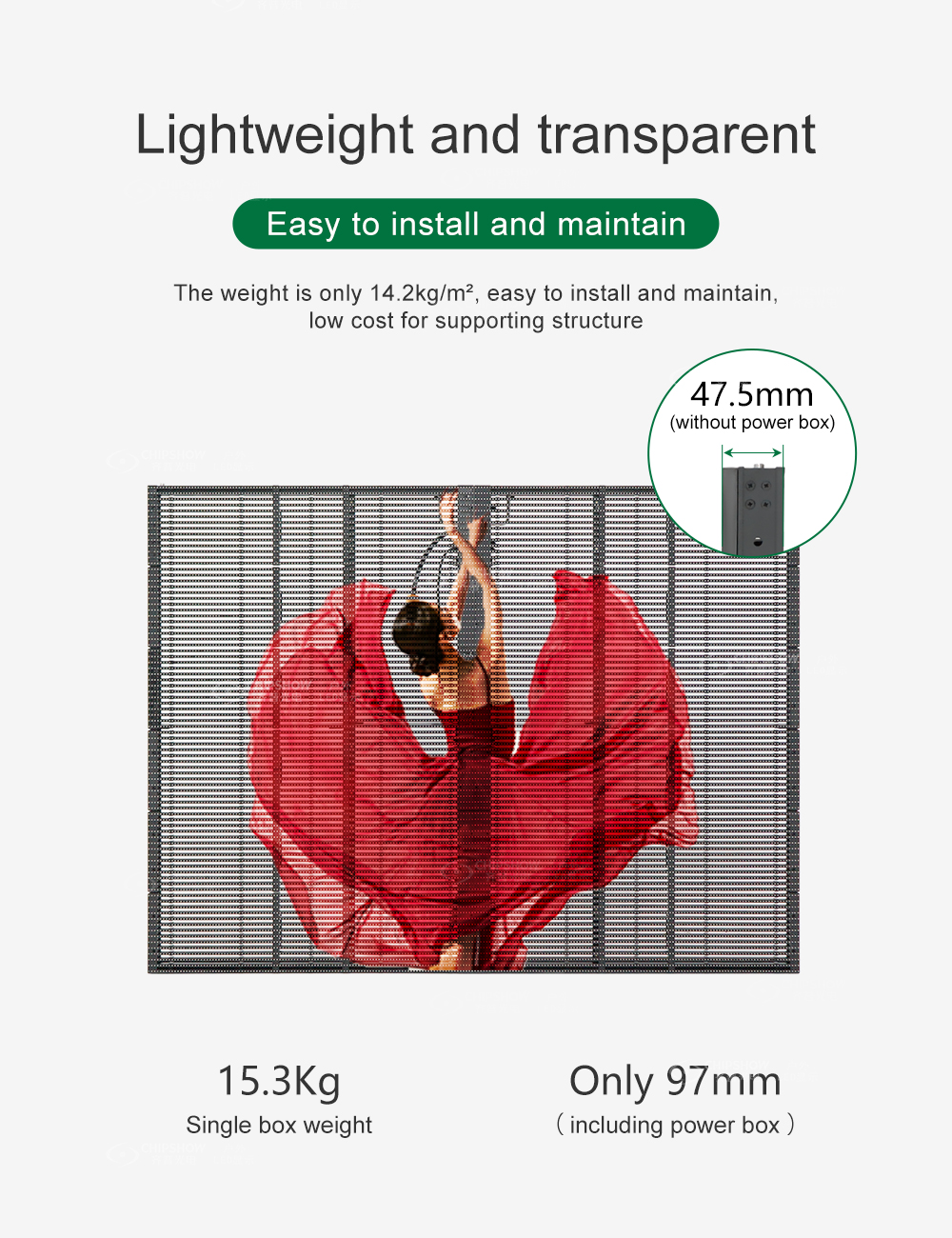 2 Haute transparence : la transparence de l'écran est supérieure à 48 % ; lorsqu'il est monté sur un mur de verre, l'écran se transforme en un mur vidéo réaliste ; et vous pouvez toujours obtenir une vue claire vers l'extérieur grâce à l'écran LED transparent ;