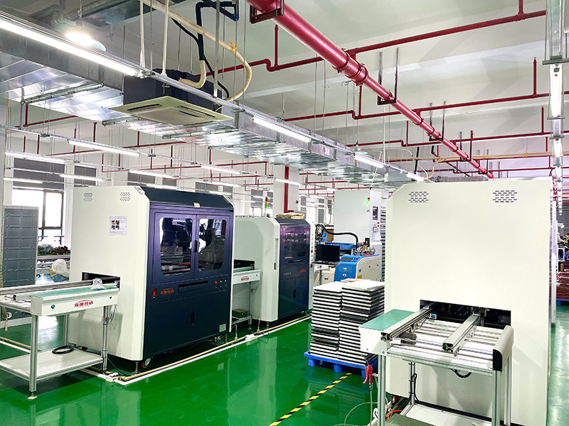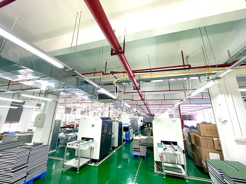 L'atelier de pré-installation de 750 mètres carrés au deuxième étage dispose de 5 lignes de remplissage de colle en ligne entièrement automatisées, 1 ligne de remplissage de colle automatique non en ligne, 2 lignes de soudage arrière, 4 lignes de vis automatiques à grande vitesse en ligne, 8 vis non en ligne lignes de machines, capacité de production quotidienne de 100 mètres carrés, capacité de production mensuelle d'environ 3000 mètres carrés;