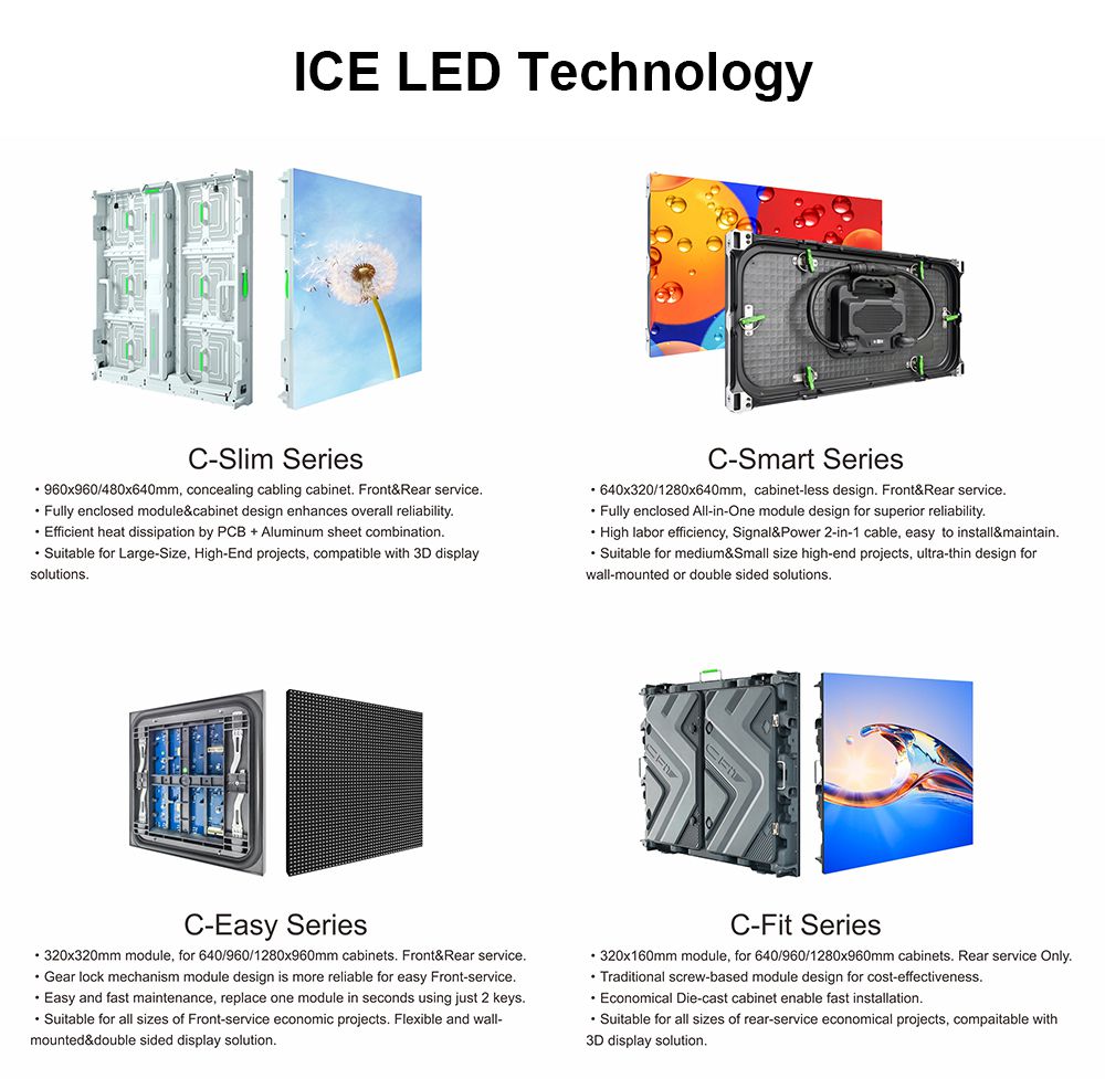 les caractéristiques de la technologie LED de l'ICE (c'est Une solution d'affichage auto-développée basée sur l'encapsulation indépendante de Perles à LED RGB et circuits d'économie d'énergie à cathode commun):