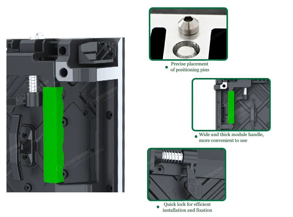 Conception magnétique : Le module d'aspiration magnétique du C-Lite-Plus P1.56 peut être maintenu à l'avant et à l'arrière, et l'aspiration magnétique entre les armoires est positionnée et installée avec précision, rendant l'installation de location plus économique et efficace.