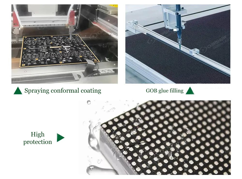 1. C-Lite-Plus P1.56, en tant qu'écran extérieur, doit avoir de fortes capacités de protection. Chipshow a pulvérisé de la peinture conforme sur ses modules et ajouté des anneaux en caoutchouc imperméables. L'avant des modules est doté d'un traitement GOB et de coulée de colle pour une protection multiple. Le savoir-faire améliore considérablement la résistance à l'eau et à l'air du C-Lite-Plus, et il peut être utilisé de manière stable à l'extérieur.