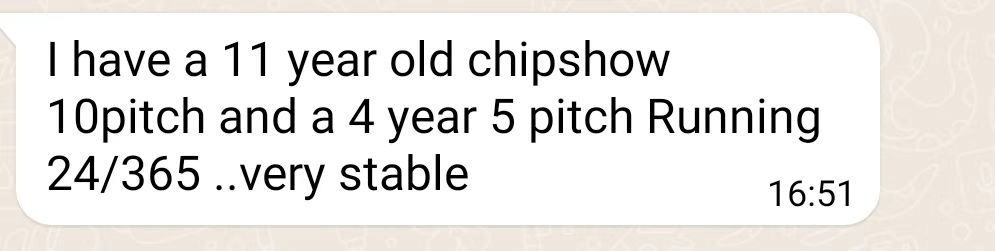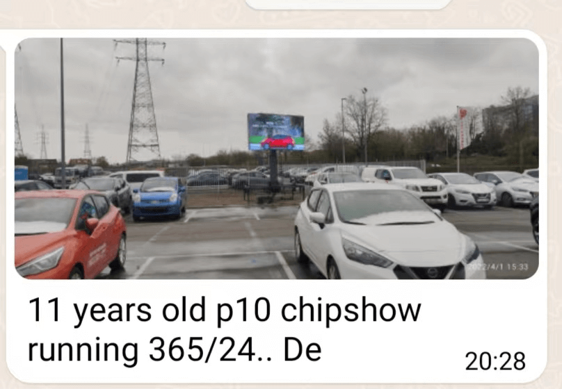 Client Européen : 11 ans P10 Chipshow courant 365/24 et P5 4 ans avec une qualité stable.