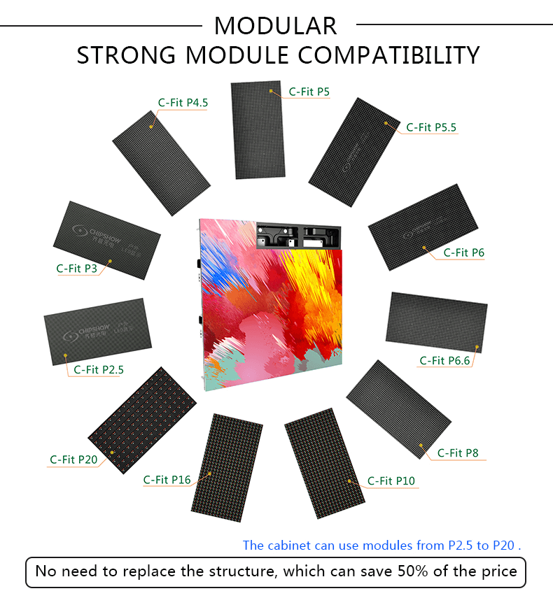 1)Nous avons des armoires de résolution P2.5-P20, répondant aux différentes demandes des clients. Modules standard, facile à mettre à niveau.